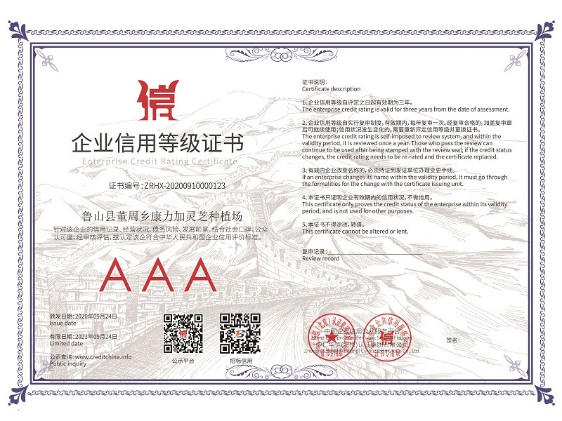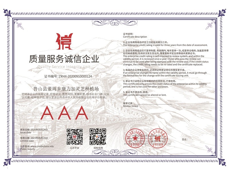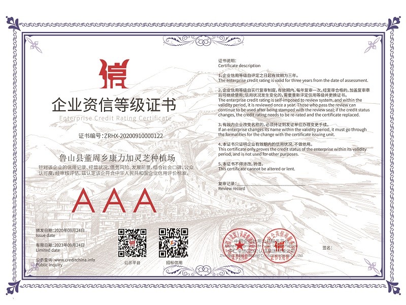 2020年國家又精準扶貧建了28個標準種植大棚,又自建了60個大棚,靈芝孢子粉的產量有望翻倍增加,產量和產值的雙倍增加,相信2023年康力加靈芝種植場會錦上添花,更上一層樓??盗拥慕洜I理念“質量第一、信譽至上、客戶最高”愿我們的合作共贏,給人們一個健康體魄!